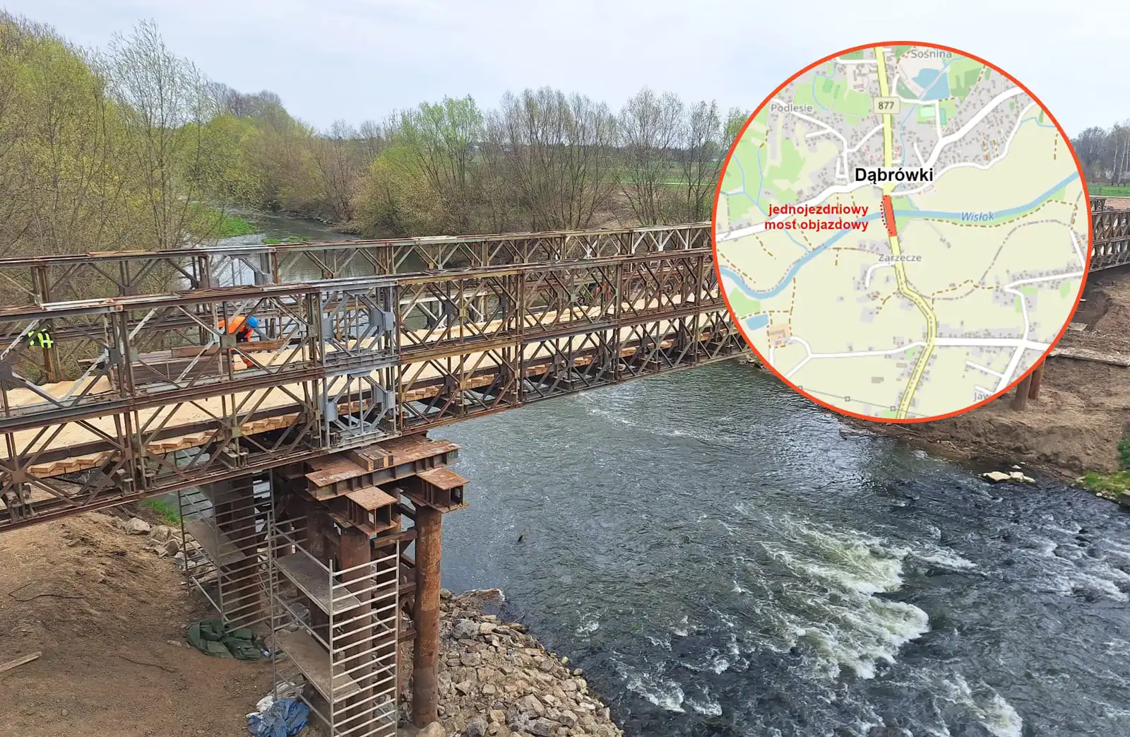 Mapa z zaznaczonym tymczasowym mostem w Dąbówkach, materiały PZDW