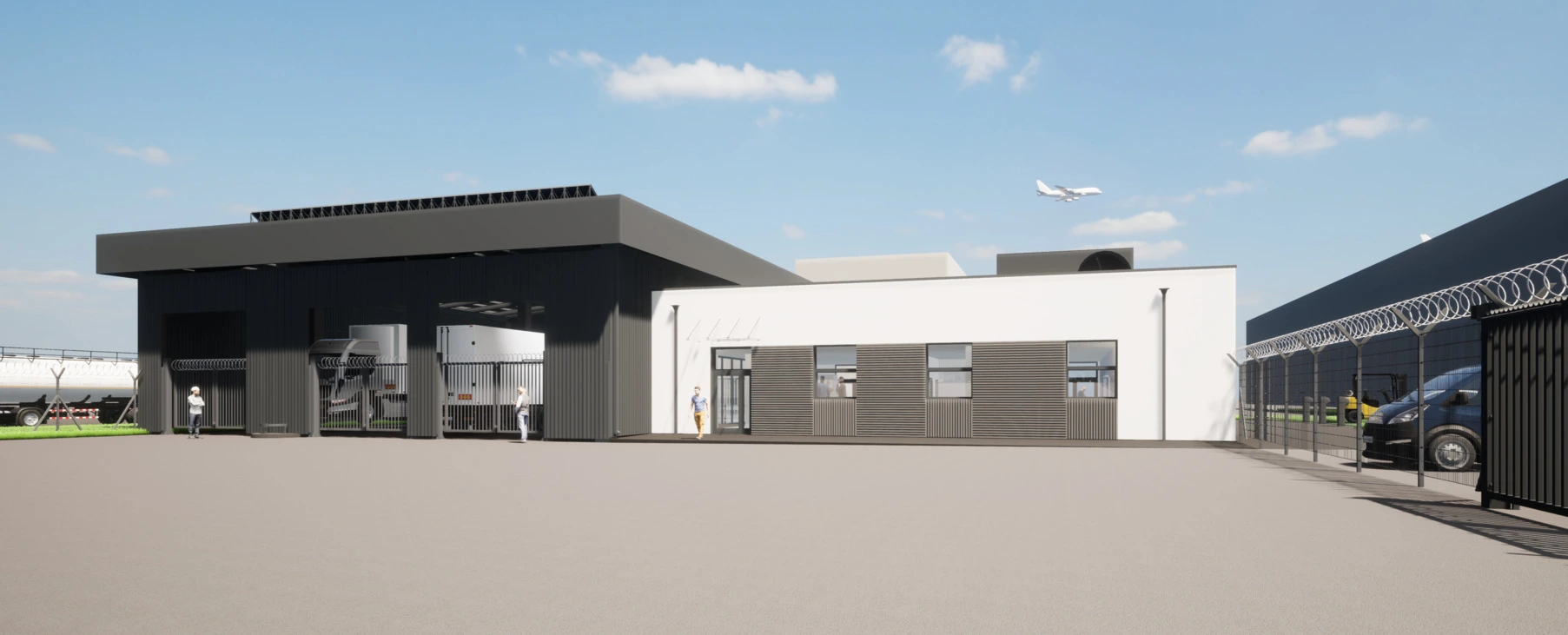 Zakres inwestycji obejmuje budowę kompleksowej infrastruktury bezpieczeństwa, w tym nowe budynki do obsługi i kontroli osób, pojazdów oraz towarów, zadaszoną śluzę kontroli pojazdów, drogi i ciągi piesze łączące nowy wjazd z rondem drogi wojewódzkiej nr 869 oraz nowoczesne systemy bezpieczeństwa, w tym kontrolę rentgenowską i radiometryczną bagażu oraz ładunków.