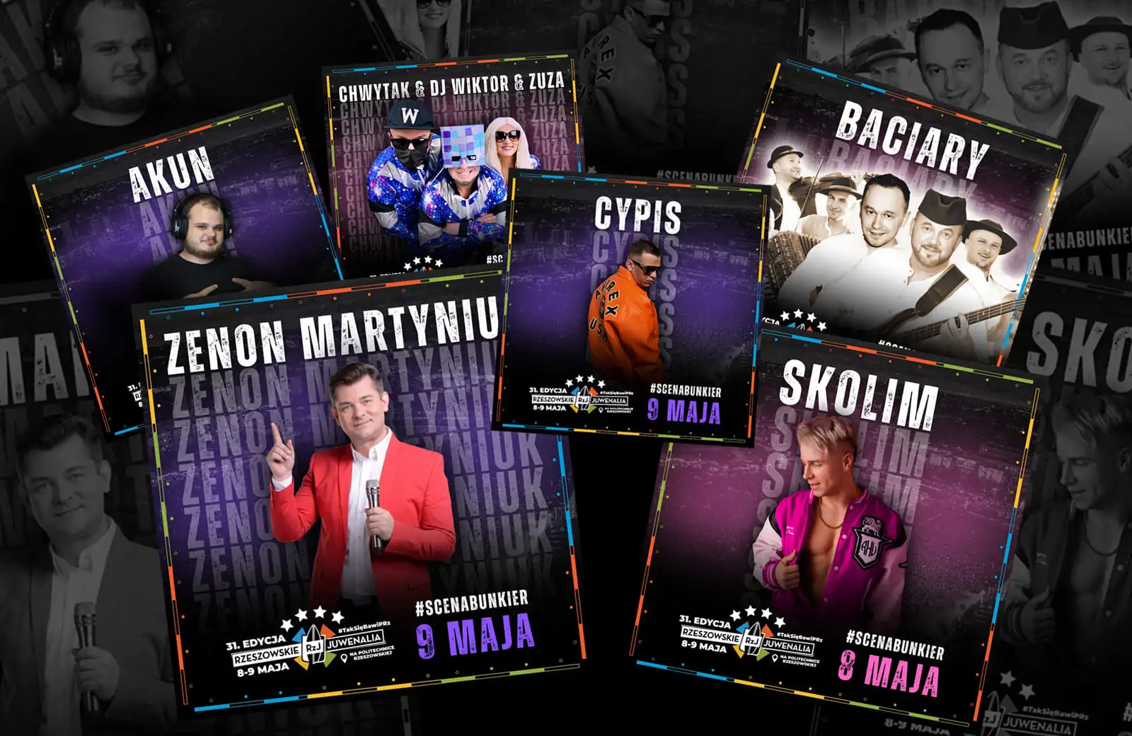 8 maja - Baciary - Skolim - Chwytak & DJ Wiktor & Zuza 9 maja - Zenon Martyniuk - Cypis - Akun |