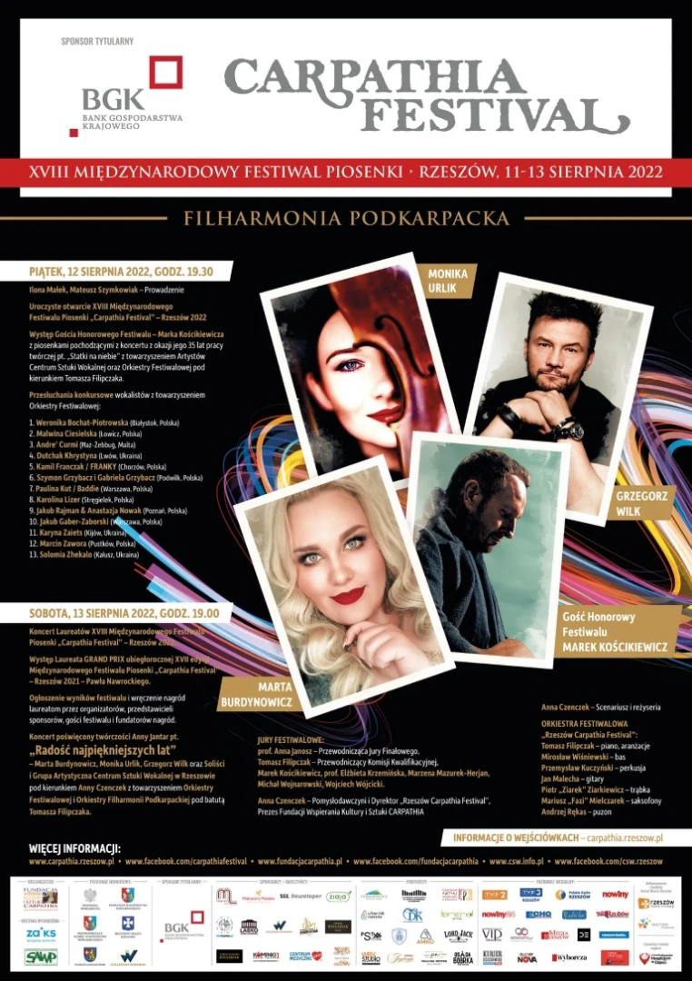 11-13 sierpnia na scenie Filharmonii Podkarpackiej do walki o nagrodę Grand Prix stanie trzynastu finalistów XVIII Międzynarodowego Festiwalu Piosenki „Carpathia Festival” – Rzeszów 2022. Gościem honorowym będzie Marek Kościkiewicz, który w tym roku obchodzi 35-lecie pracy artystycznej, a podczas Koncertu Laureatów zabrzmią przeboje Anny Jantar w wykonaniu gwiazd i artystów z Centrum Sztuki Wokalnej pod kierunkiem Anny Czenczek z towarzyszeniem dwóch orkiestr pod batutą Tomasza Filipczaka.
