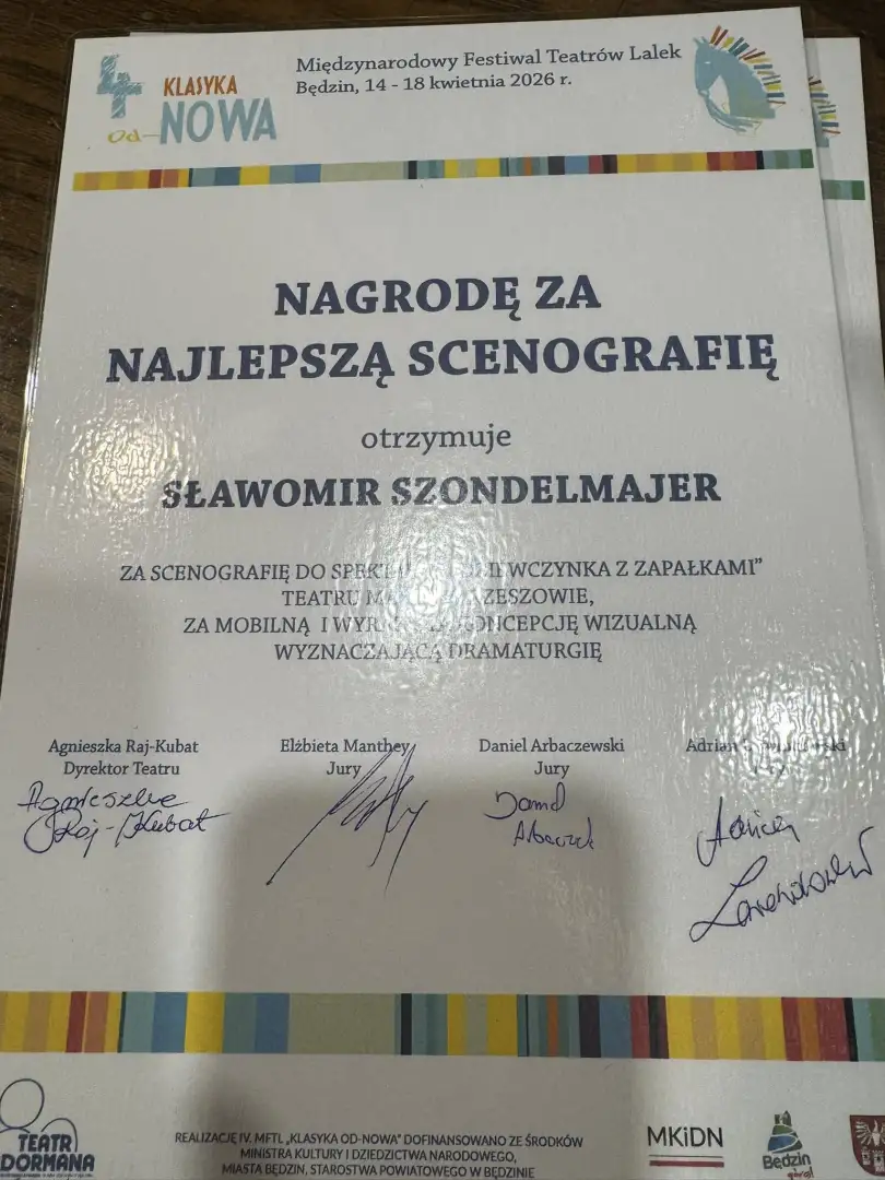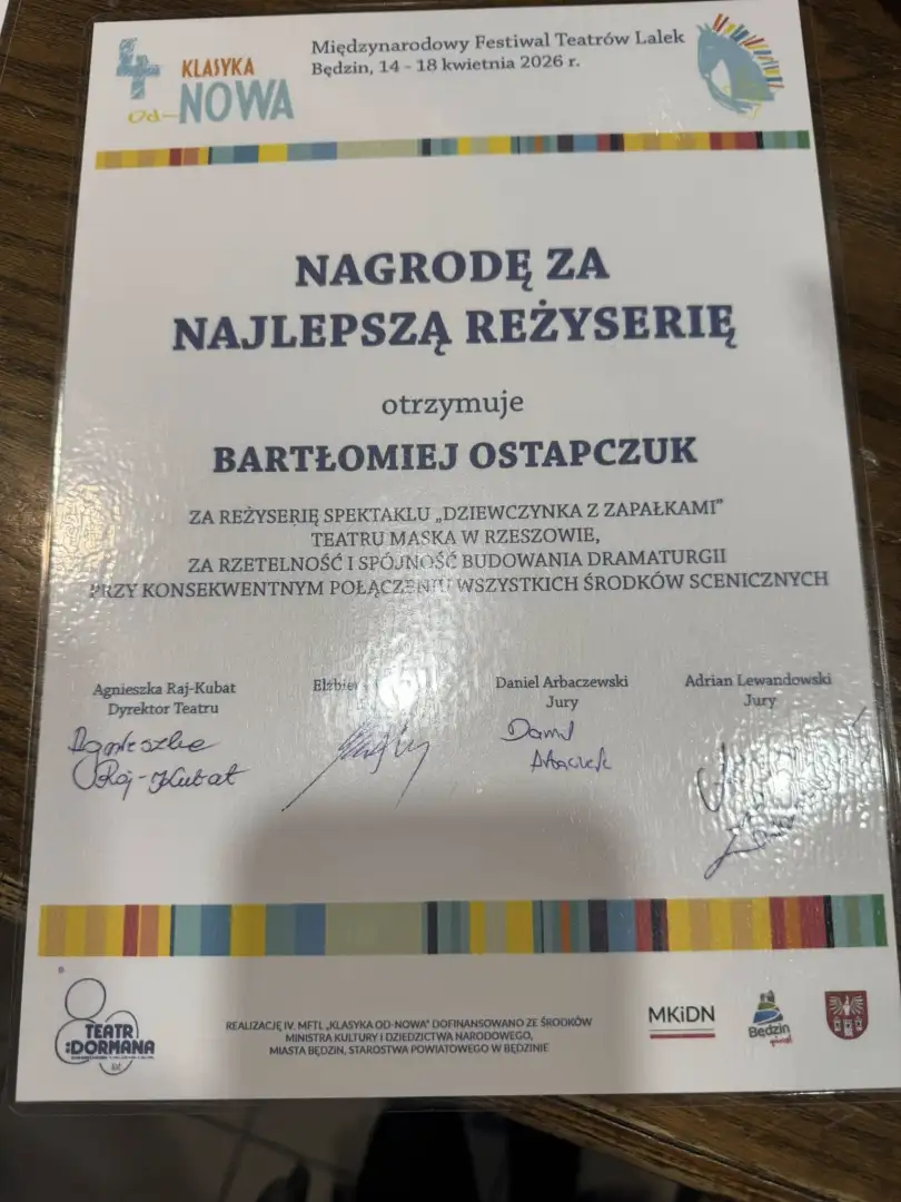 Spektakl "Dziewczynka z zapałkami" rzeszowskiego teatru lalek „Maska” został uhonorowany dwiema nagrodami na zakończonym kilka dni temu IV Międzynarodowym Festiwalu Teatrów Lalek "Klasyka Od-Nowa" w Będzinie.
