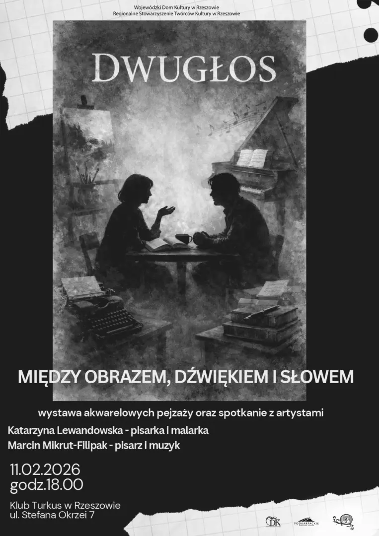 „Dwugłos” to spotkanie Katarzyny Lewandowskiej i Marcina Mikruta-Filipaka — twórców, których pisanie wyrasta z innych dziedzin sztuki: malarstwa i muzyki. Choć oboje posługują się słowem, każde z nich przychodzi do niego inną drogą — przez obraz i przez dźwięk.