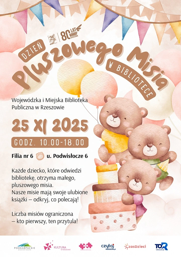 Wojewódzka i Miejska Biblioteka Publiczna w Rzeszowie zaprasza na Dzień Pluszowego Misia w Bibliotece, który odbędzie się 25 listopada 2025, godz. 10.00–18.00 w Filii nr 6 przy ul. Podwisłocze 6.