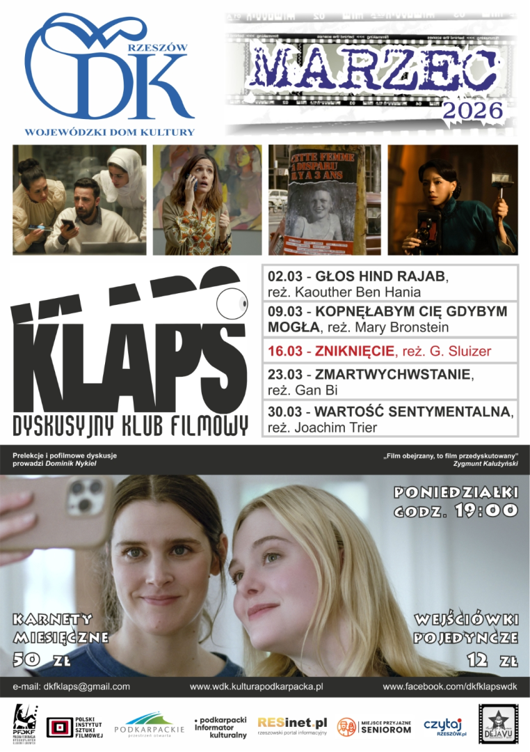 Dyskusyjny Klub Filmowy „Klaps” działający w Wojewódzkim Domu Kultury w Rzeszowie zaprasza w nadchodzącym miesiącu na kolejne projekcje filmowe połączone z prelekcjami i pofilmowymi dyskusjami, które prowadzi Dominik Nykiel.