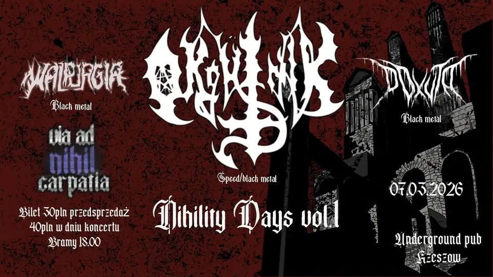 Już 7 marca 2026 roku zapraszamy do Underground Pubu na pierwszą odsłonę Nihility Days, organizowaną przez Via Ad Nihil Carpatia. Na scenie wystąpią trzy składy, a jednym z nich będzie Okrütnik.