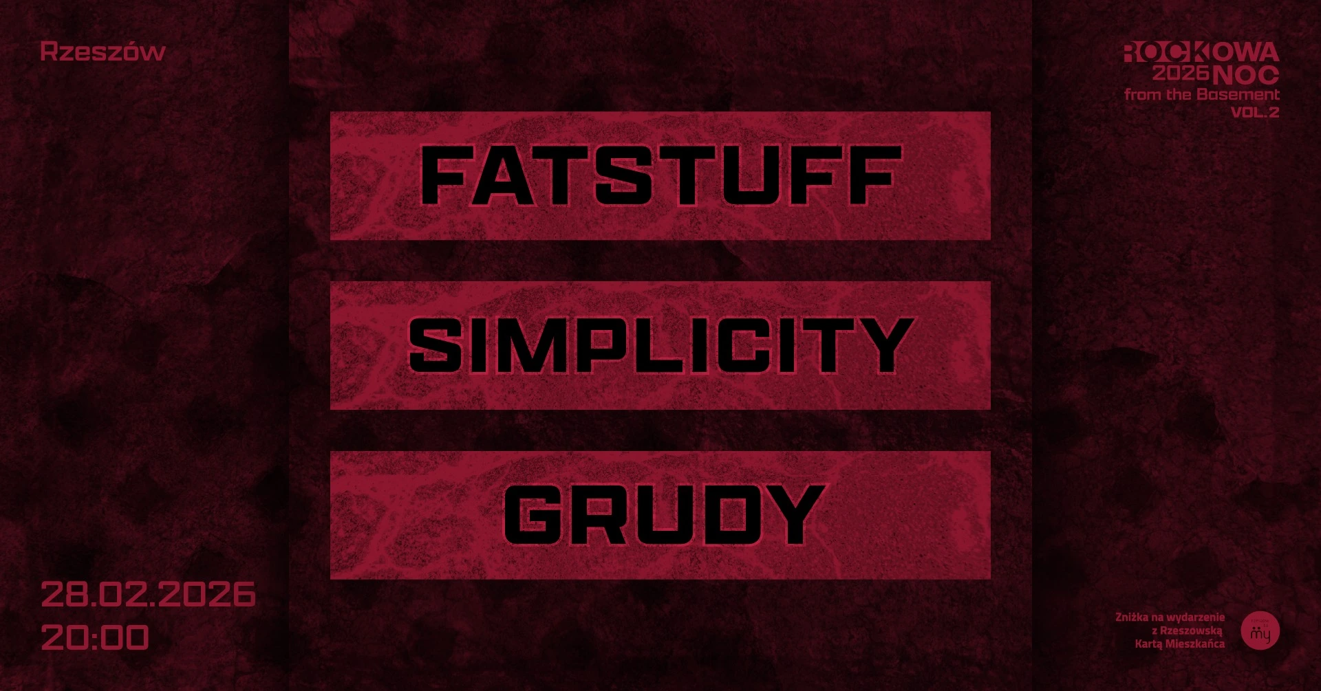 Koncert odbędzie się 28 lutego 2026 r. w Rzeszowskich Piwnicach. Zagrają dla Was: FATSTUFF, SIMPLICITY, GRUDY. Wydarzenie rozpocznie się o godz. 20:00. Ceny biletów w przedsprzedaży: 50 zł, w dniu koncertu zapłacisz 60 zł. Wejściówki dostępne są na stronie rzeszowskiepiwnice.pl oraz w Rzeszowskich Piwnicach. Przy zakupie stacjonarnym z Rzeszowską Kartą Mieszkańca otrzymasz 10% zniżki.
