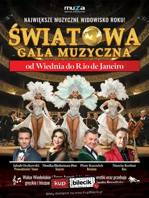 Agencja Artystyczna Muza zaprasza na ogólnopolską trasę koncertową, która już wkrótce zawita do największych miast Polski! Przed Państwem niezwykła muzyczna podróż przez kontynenty, style i nastroje - koncert pełen emocji, barw i ponadczasowych melodii od arystokratycznego Wiednia, przez słoneczne Hawaje, Grecję, Hiszpanię, Włochy aż po roztańczone Rio! "Światowa Gala Muzyczna - od Wiednia do Rio de Janeiro" to prawdziwe święto muzyki - pełne pasji, nostalgii, zachwytu i radości życia. W programie zabrzmią majestatyczne walce wiedeńskie, gorące tanga argentyńskie, największe hity operetkowe, a także rozkołysane przeboje greckie, hiszpańskie i włoskie.