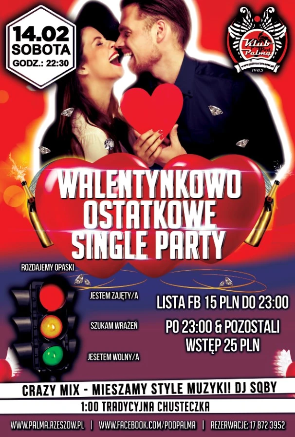 Jesteś samotna/samotny? Szukasz swojej drugiej połówki, miłości, flirtu lub przygody? Jeśli tak, to gorąco zapraszamy Cię w sobotę 14 lutego do Klubu Pod Palmą. Już nie musisz się zastanawiać czy dziewczyna/chłopak która/y wpadł/a Ci w oko jest wolna/y, czy zajęta/y. W czasie naszej imprezy wchodząc do klubu otrzymasz specjalną opaskę w jednym z trzech kolorów. Każdy z nich ma swoje znaczenie i ułatwi znalezienie osoby, która dziś chce bawić się tak jak Ty: